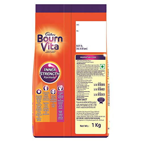 Cadbury Bournvita is a nutrition brand with a 70 year legacy in India. Cadbury Bournvita is a health food drink with inner strength formula which has nutrients that support – Immune system(8 immunity nutrients), Strong bones (Vitamin D, Phosphorous), Strong muscles (Protein, Vitamin D) and Active Brain(Iron, Iodine, Vitamin B2, Vitamin B12). Recommended 2 serves per day as part of a balanced diet and a healthy lifestyle.
