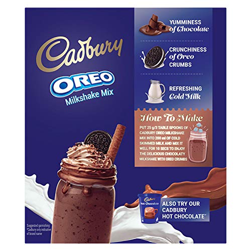 Enjoy delicious chocolaty Oreo crumb milk shake with the all new Cadbury Oreo milkshake mix. This scrumptious Oreo shake will delight your taste buds with yumminess from the first sip right down to the last. Put 25g/3 table spoons of milkshake mix in approximately 200ml of cold milk and mix well for 10 seconds to enjoy this shake with the yumminess of chocolate and the crunchiness of Oreo. Top it up with whipped cream and some pieces of Cadbury dairy milk chocolate and Oreos for an even more delectable experience.