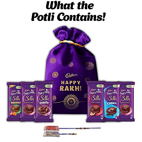 Add Excitement and fervour to the Traditions Of Festivals By Gifting Your Friends And Family This Exclusively Designed potli By Cadbury. This Rakhi potli contains any 6 Cadbury chocolates from the following options -Silk Bubbly 50g, Silk Fruit & Nut 55g, Silk Roast Almond 58g, Silk Oreo 60g and Silk Plain 60g along with a Rakhi, a Lumba and roli chawal