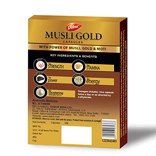 Do you feel lack of strength & stamina? Do feel lack of power during the days & nights? Are you looking for more strength & power in daily life? If your answer to the above questions is yes then Dabur Musli Gold is for you. MusliGold is an Ayurvedic formulation which is good for improving strength, stamina and power and is beneficial in relieving general weakness It contains “Kapikacchu” which is an antioxidant & has neuroprotective effectShuddha musli(Purified Shilajit), helps in ATP synthesis in muscle, it is useful in stress & has antioxidant properties This also contains Aswagandha which helps in stress and is good for immunity Akarakarabha & Safed Musali are Strength enhancers Gokshura has anti-fatigue properties Swarna Bhasma, Rajat bhasma, Yashad Bhasma: These are physical strength and endurance enhancers & they have antioxidant properties.
