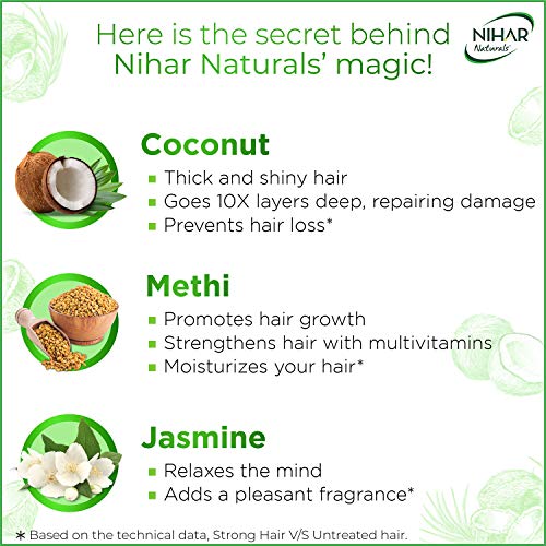 Nihar Naturals comes with the goodness of Coconut and Methi to give you thick and beautiful hair (based on technical study, compared to untreated hair)